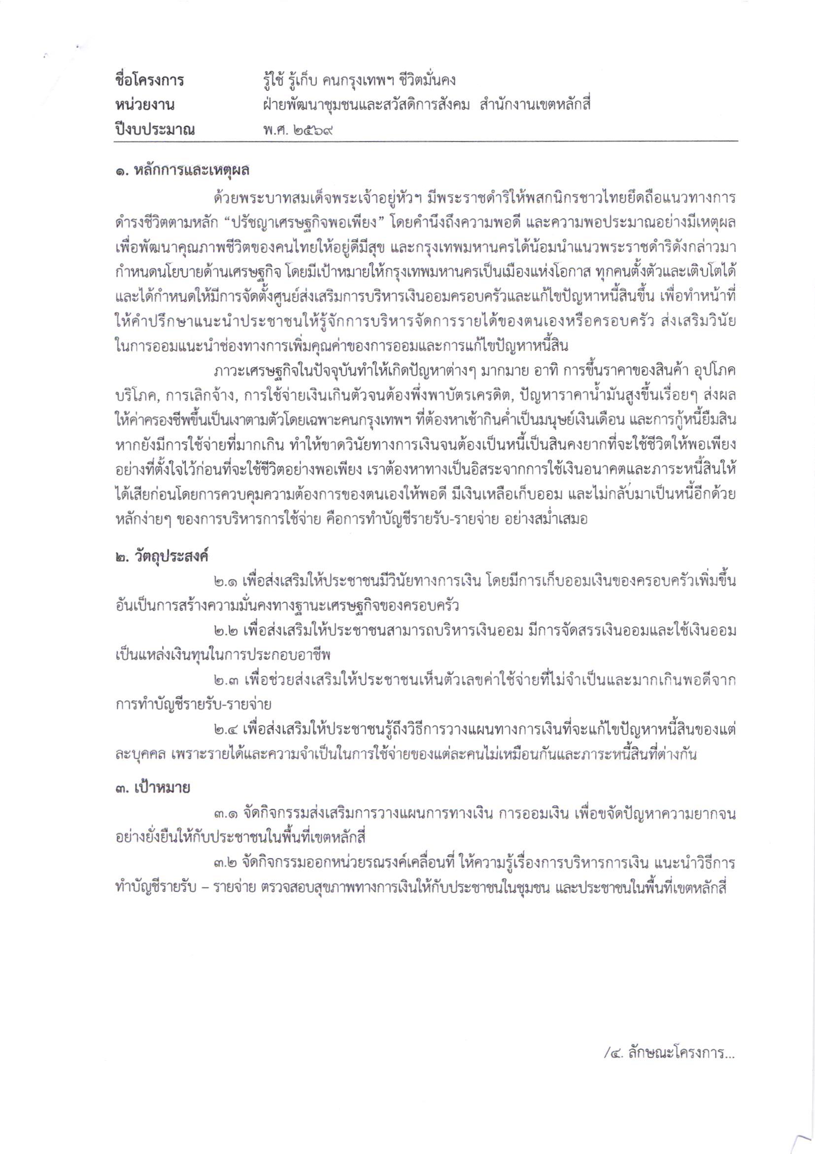 ค่าใช้จ่ายโครงการรู้ใช้ รู้เก็บ คนกรุงเทพฯ ชีวิตมั่นคง 20,000.00100.00สำนักงานเขตหลักสี่ฝ่ายพัฒนาชุมชนและสวัสดิการสังคม