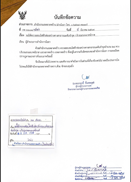 14-03-20241.40ฝ่ายโยธาได้สำรวจตรวจสอบไฟฟ้าส่องสว่างบนถนนนาคนิวาส พบดับชำรุด 24 ดวง ทั้งนี้ได้มีหนังสือแจ้ง สนย. เพื่อดำเนินการแก้ไขต่อไป